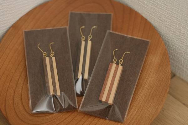 キューブピアスとストライプピアス。対馬ヒノキと色のある木を組み合わせています。 革の新作とともにこちらも明日、空港に納品予定です。